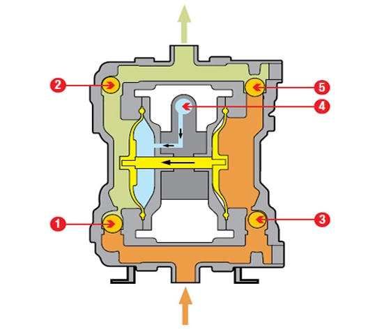 Khí hoặc chất lỏng truyền động phía sau màng tiếp tục tạo áp lực, đảm bảo rằng mọi phân tử chất lỏng đều được đẩy hoàn toàn ra khỏi buồng bơm mà không bị rò rỉ hay tràn ngược. Quá trình này diễn ra một cách tuần hoàn và kiểm soát tốt, nhờ thiết kế thông minh của hệ thống van một chiều, cho phép ngăn ngăn không cho chất lỏng quay trở lại buồng bơm khi chu kỳ bơm tiếp tục.Như vậy, việc phối hợp nhịp nhàng giữa màng bơm và hệ thống van không chỉ tối ưu hóa năng suất bơm mà còn giảm thiểu tối đa hiện tượng hao hụt hay giảm áp suất không mong muốn.